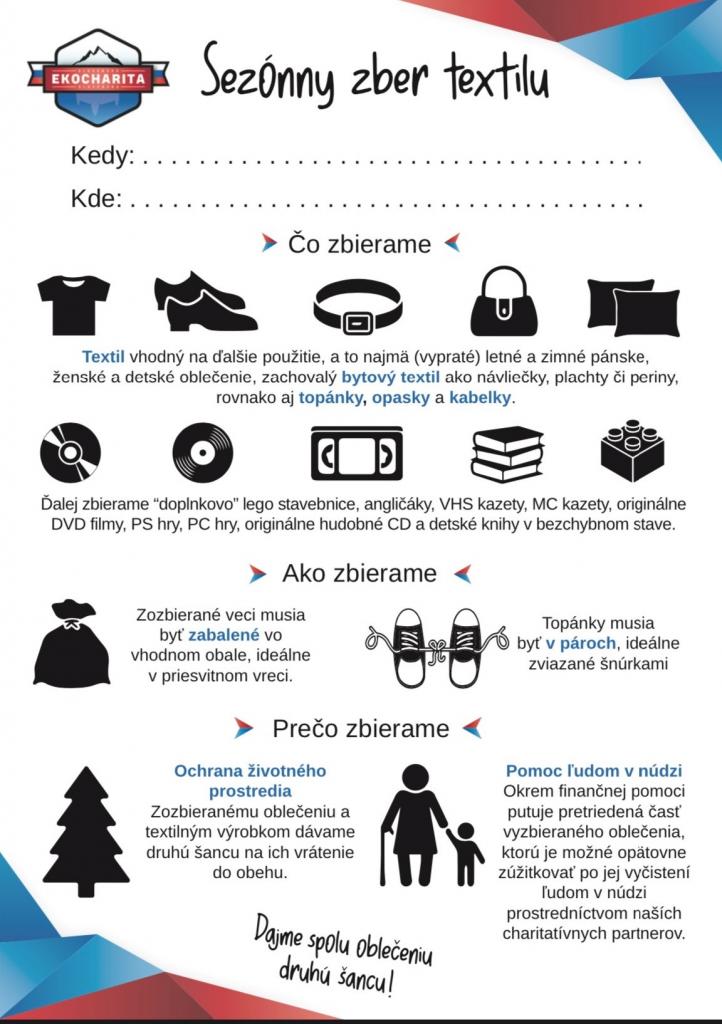 Zbierať sa budú odevy a iný textil, ktoré sú však použiteľné a čisté (nie odpad) a tie je potrebné zabaliť do vhodného obalu - ideálne do priesvitného vreca.