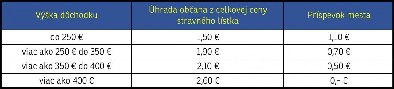 Zároveň oznamujeme, že došlo k úprave výšky príspevku mesta na stravovanie podľa výšky dôchodku. Aktuálna hodnota stravného lístka a príspevku mesta od 1.1.2021: